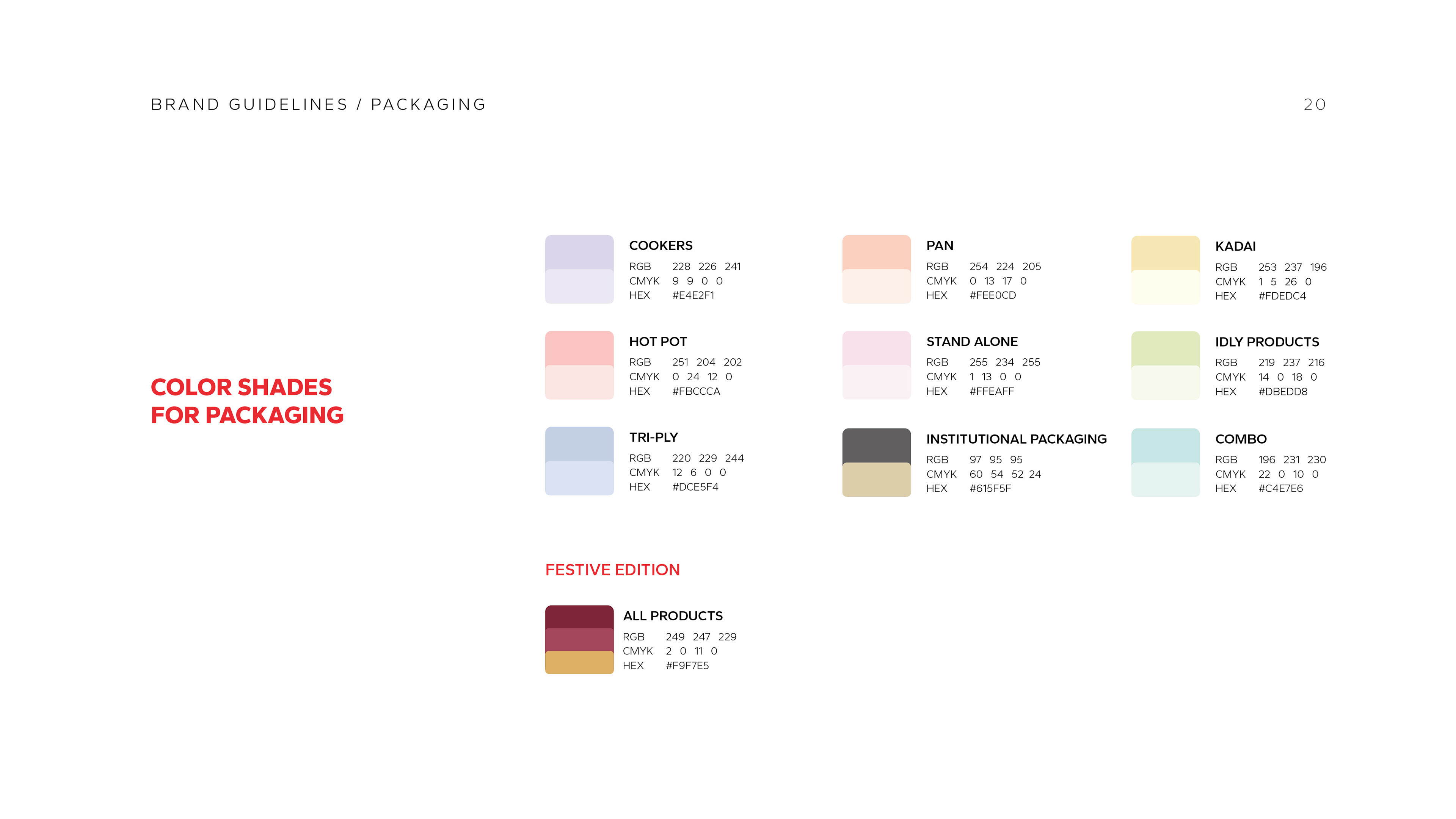 Key sections of the guideline, including typography, color palette, packaging references, and icon style.