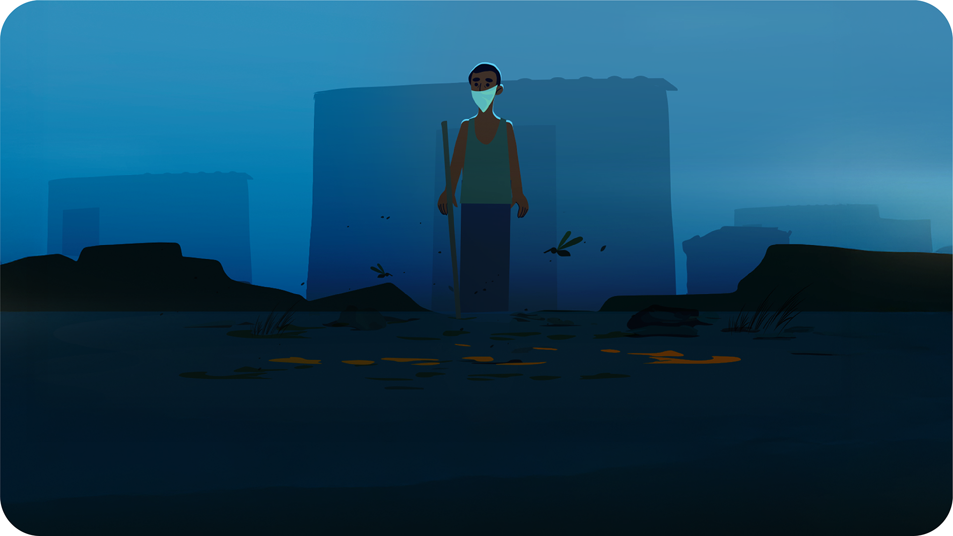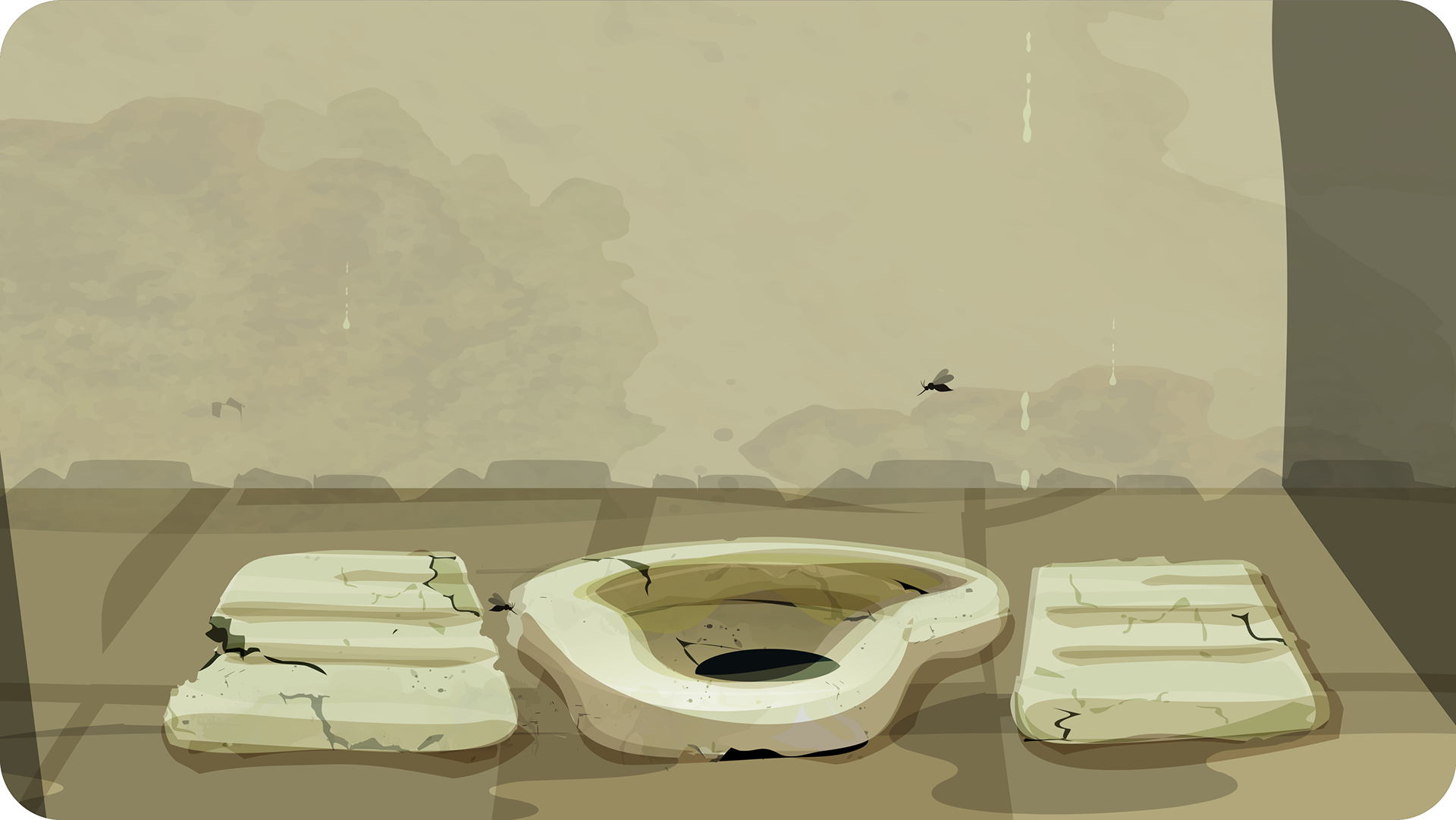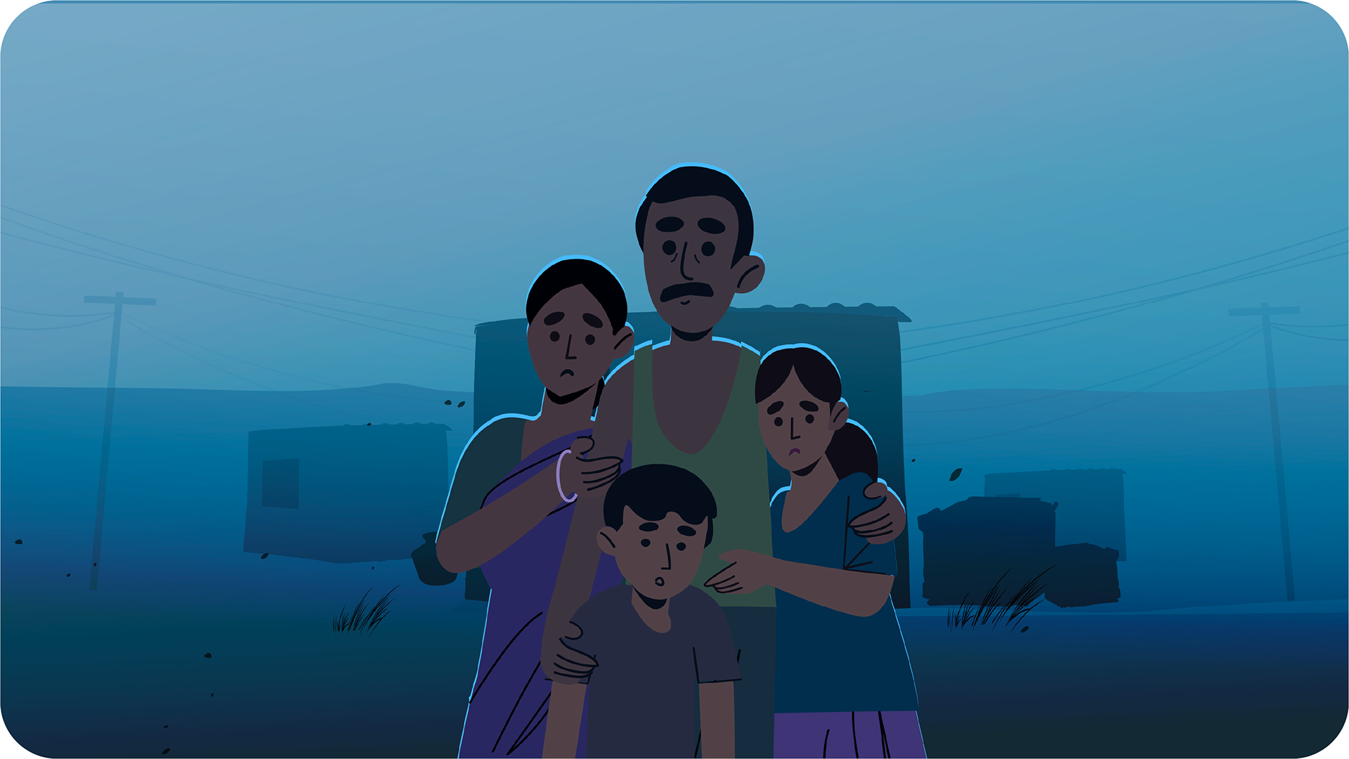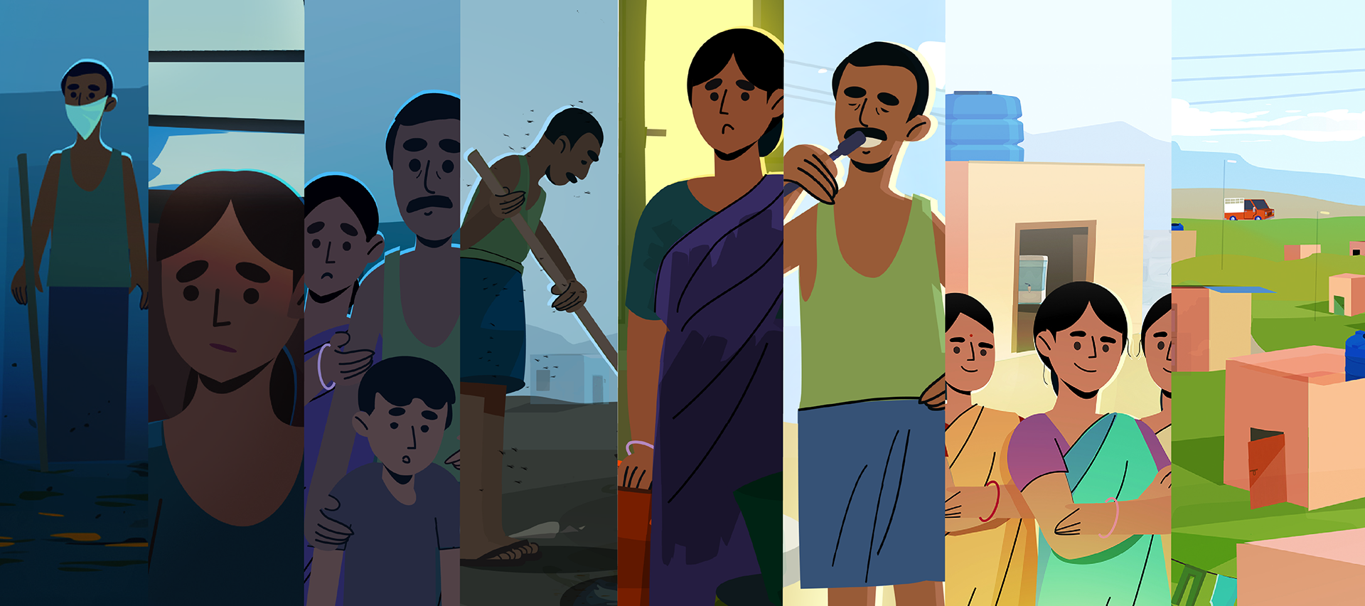 A visual transition from muted, desaturated tones to brighter palettes, reflecting the shift from contamination and fear to awareness, solution, and improved living conditions enabled through accessible financial support.