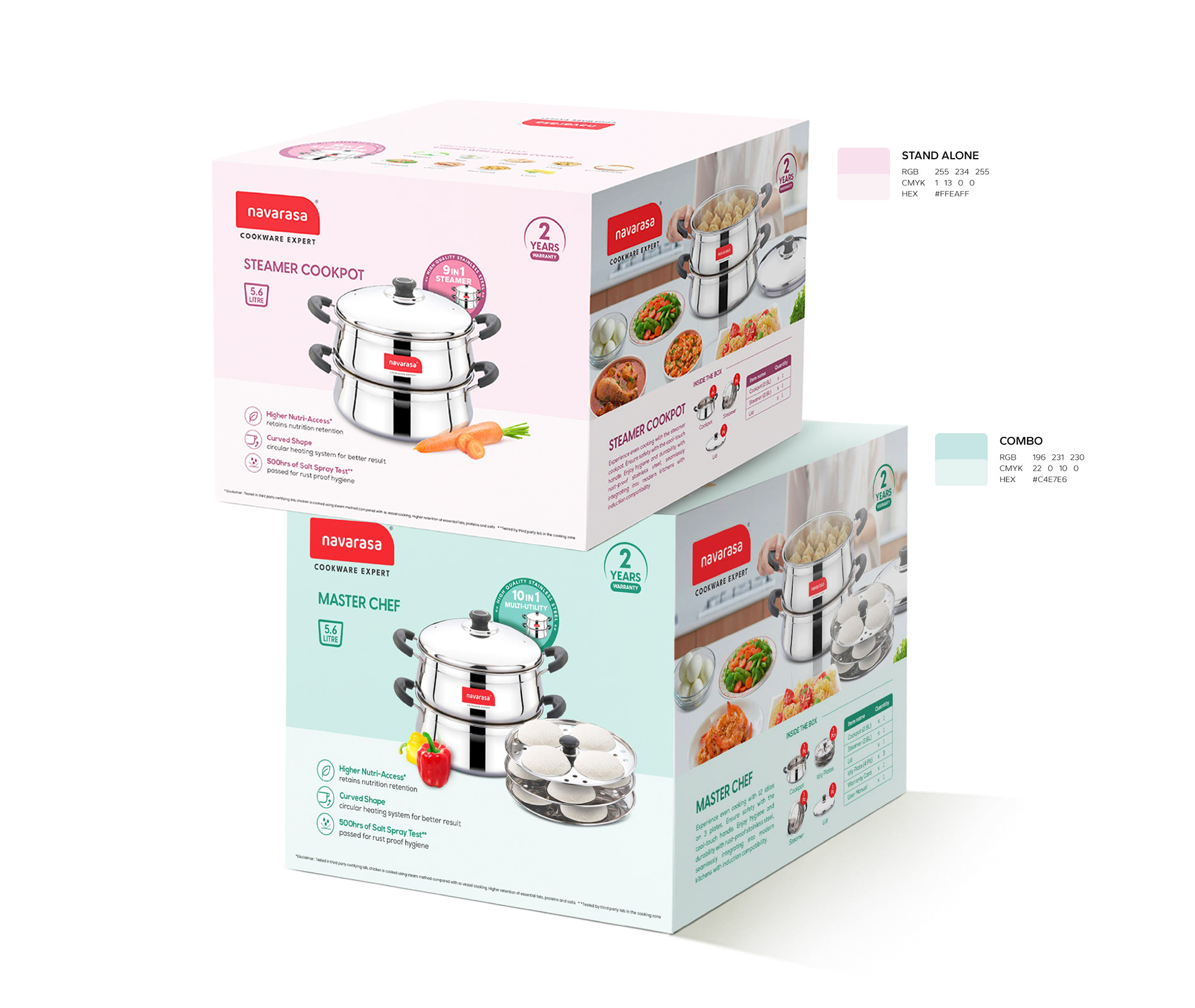 To design a packaging system for Navarasa cookware that stands out on retail shelves while maintaining visual consistency across a large and diverse product range with varying categories and sizes.