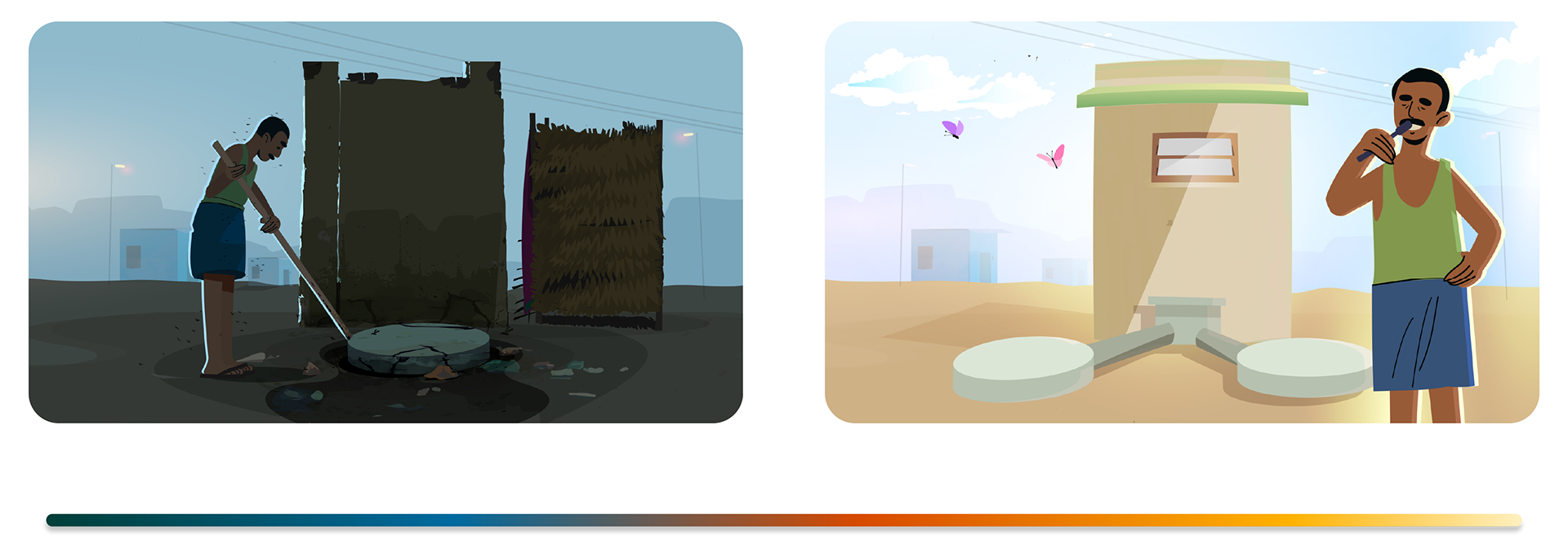 A visual transition from muted, desaturated tones to brighter palettes, reflecting the shift from contamination and fear to awareness, solution, and improved living conditions enabled through accessible financial support.